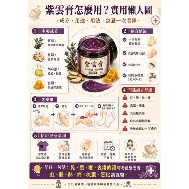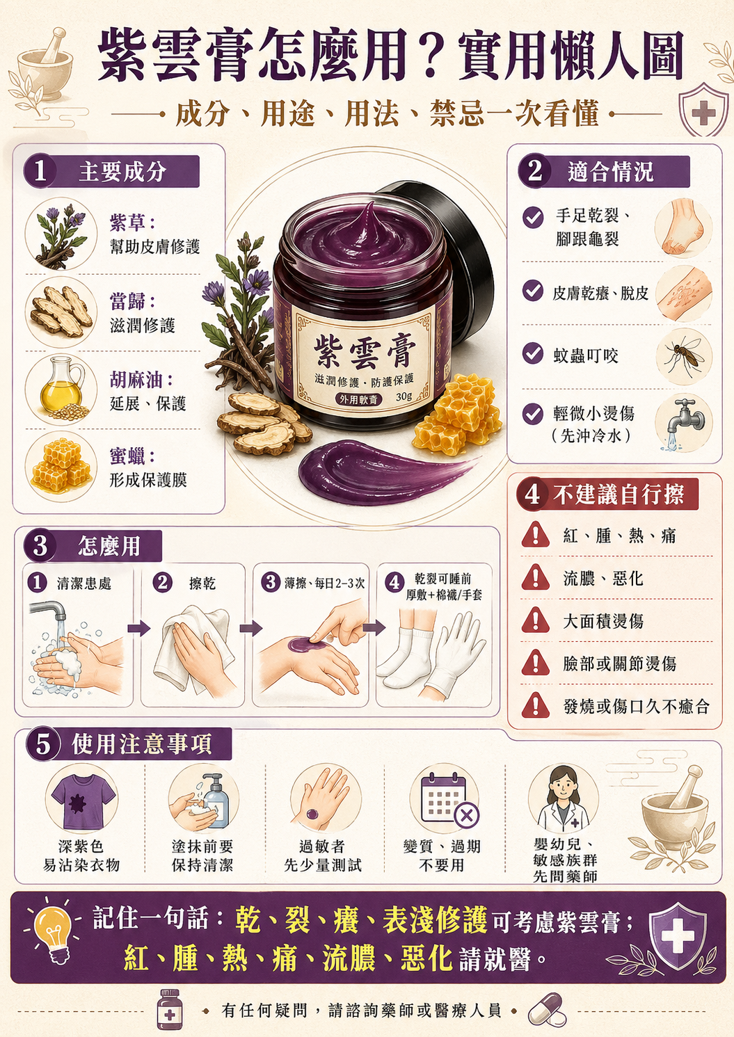 紫雲膏是許多台灣家庭藥箱裡常見的中藥外用膏。打開後常會看到深紫色膏體,聞起來帶有麻油香,長輩常拿來擦乾裂、蚊蟲叮咬、小燙傷或皮膚乾癢。雖然它看起來像「萬用膏」,但從藥師角度來看,紫雲膏並不是什麼皮膚問題都適合,最重要的使用原則是:適合偏乾、表淺、非嚴重感染的皮膚修護;若已流膿、紅腫擴散或疼痛加劇,就不應只靠紫雲膏處理。 原文也提到,紫雲膏常被用於蚊蟲叮咬、小燙傷、皮膚乾燥脫皮等居家情境。